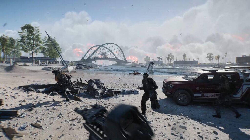 فورت لیندون دارای بالگرد، تانک و قابلیت تخریب گسترده است — درست همانطور که از یک بازی بتلفیلد انتظار دارید. یکی از خطرناکترین ویژگیهای این نقشه، دایرهی مرگ (circle) است؛ آتشی که اگر لمسش کنید، شما را بلافاصله از بین میبرد. برای زنده ماندن، باید مکانهای نقشه را یاد بگیرید و همیشه جلوتر از بستهشدن دایره حرکت کنید.