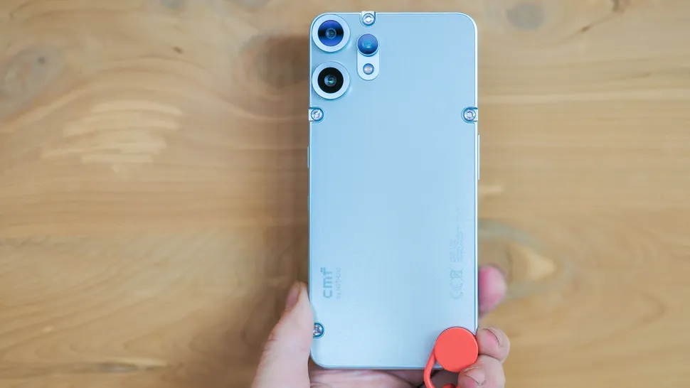 من این طراحی را دوست دارم. به نظر نمی‌رسد که بی‌دقت باشد – واضح است که طراحی غیرهمسان این گوشی با فکر و دقت انجام شده است. شما نمی‌توانید تمام پوشش پشت CMF Phone 2 Pro را بردارید، همان‌طور که می‌توانستید در مدل قبلی، اما همچنان یک پیچ دایره‌ای کوچک وجود دارد که می‌توانید آن را بردارید تا لوازمی مانند بند گردنی (یا فقط holder بند، که می‌تواند حلقه‌ای برای آویز کردن تزئینات باشد) را وصل کنید.