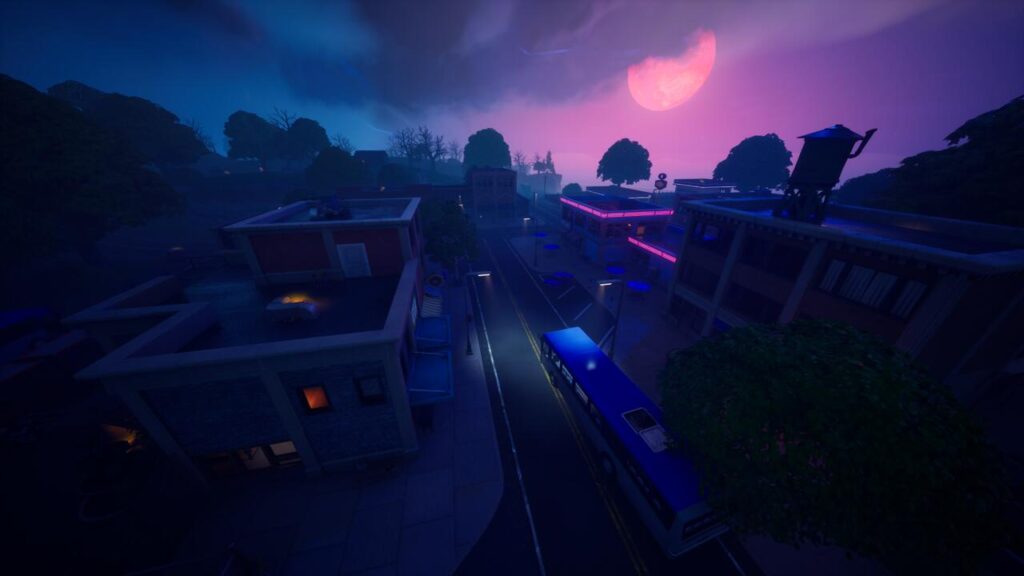 - ارتفاعات هاوکینز (Hawkins Heights): این بخش علاوه بر معماری خود، یک المان بصری قابل توجه دارد: تابلوی سینما که به صورت ضمنی، رویداد نهایی فصل ۶ فورتنایت را تبلیغ میکند، هرچند که هیچ سینمای فعالی در نقشه وجود ندارد.