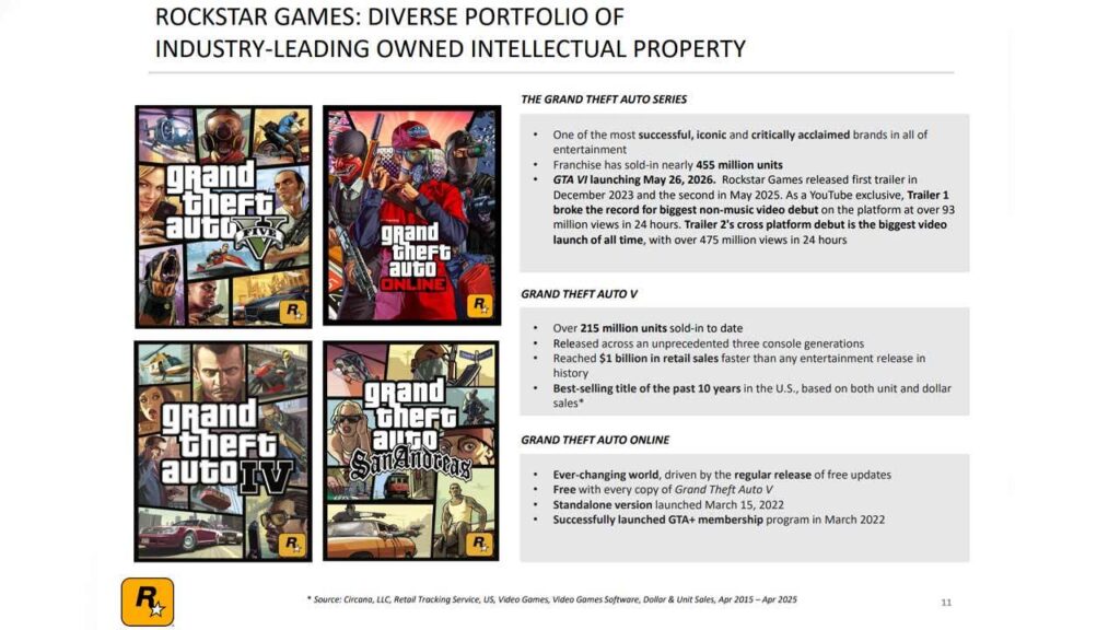 شرکت مادر راکاستار، Take-Two Interactive آماری از فروش سری GTA منتشر کرد. براساس این آمار فروش کلی مجموعه بازیهای Grand Theft Auto اکنون به حدود ۴۵۵ میلیون نسخه رسیده است. تقریبا نیمی از این رقم مربوط به GTA V است که تاکنون بیش از ۲۱۵ میلیون نسخه فروش داشته است.